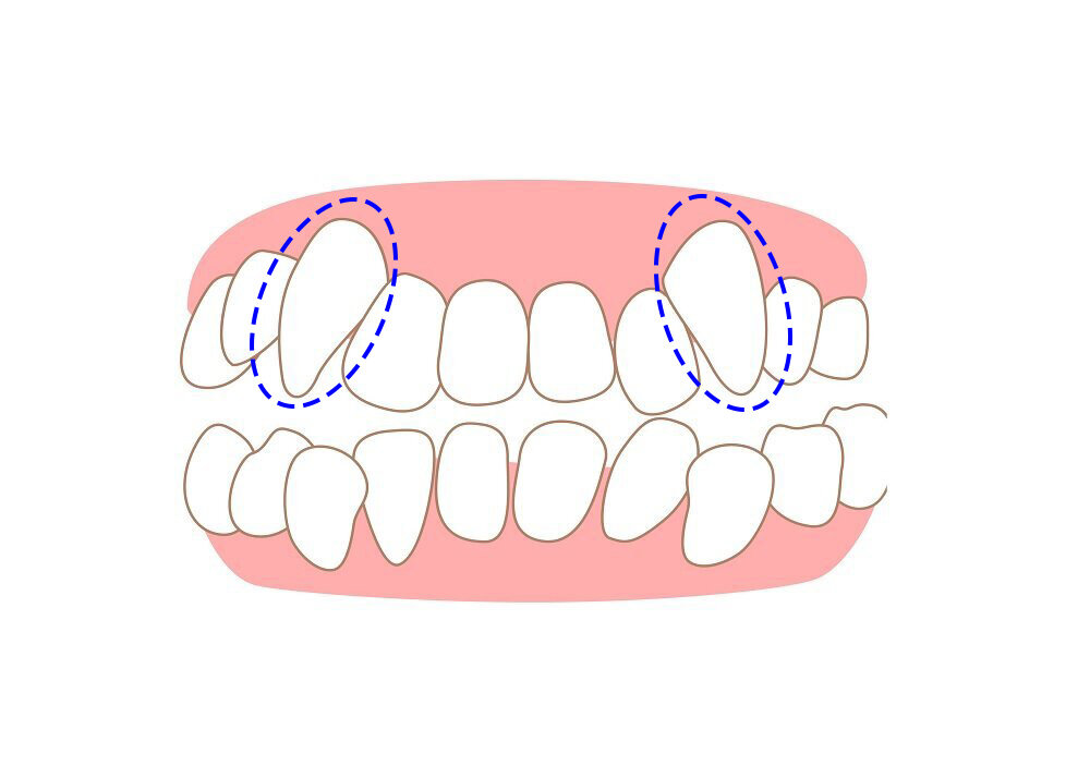 八重歯とは、上の歯の前から3番目に生える犬歯が、両隣の歯よりも外側の位置に飛び出して生えている状態の歯のことを言います。また、乱杭歯(らんぐいば)や叢生(そうせい)と呼ばれることもあります。