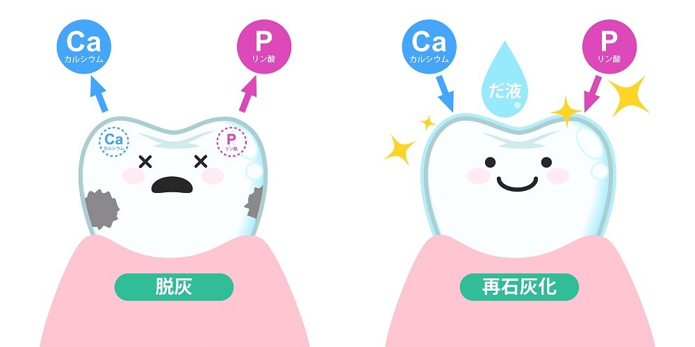 しかし唾液などの働きによってカルシウムやリン酸が再び歯に取り込まれると、歯は脱灰から元の状態に戻ります。このしくみが再石灰化です。