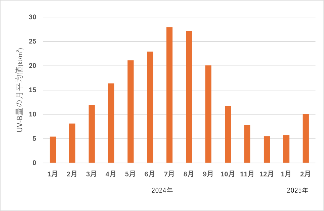 実は、日差しが弱い冬でも紫外線対策は大切です。冬の紫外線量は夏に比べて減少します。皮膚の表面に起きる日焼けや炎症に関わるUVBは、春頃から上昇し始め7月~8月にピークを向かえます。